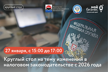 27 января, с 15:00 до 17:00, Минэкономразвития региона совместно с УФНС по Камчатскому краю в Центре «Мой бизнес» проведут круглый стол на тему изменений в налоговом законодательстве с 2026 года.